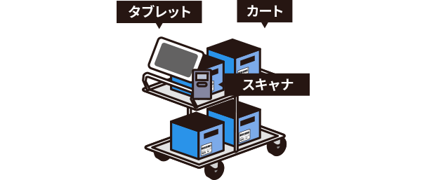 ピッキング作業を始める前に、カート、バーコードスキャナ、タブレットを用意します。
